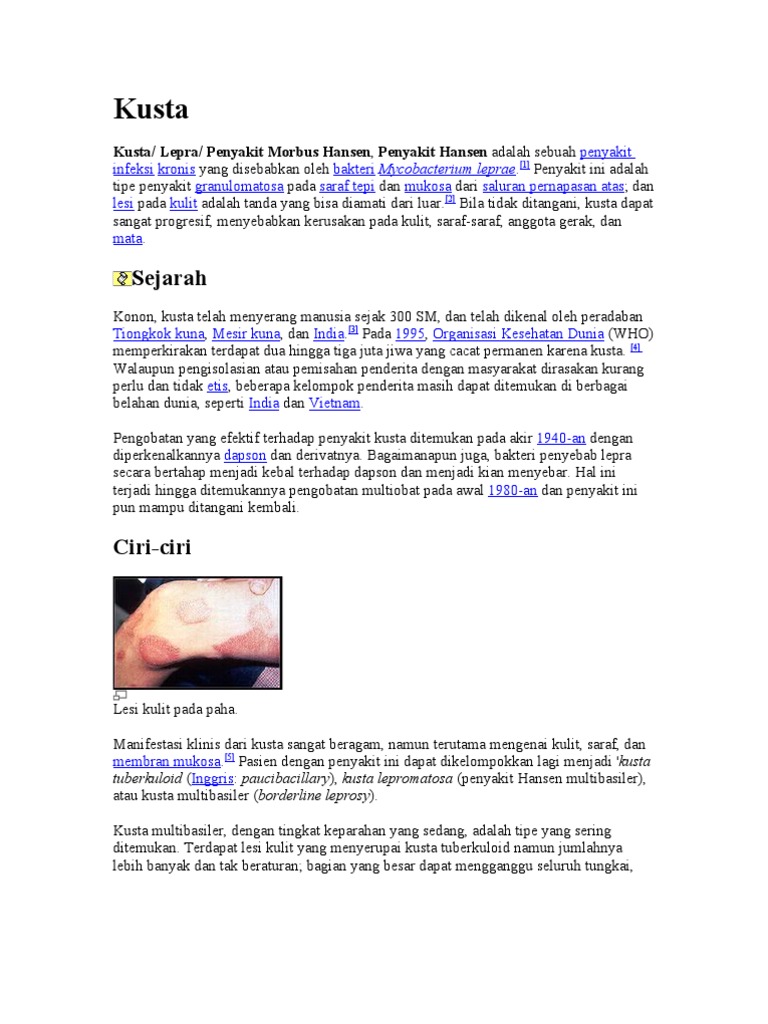 Penyakit Kusta from s.yimg.com Di malaysia, kes penyakit kusta direkodkan seawal tahun 1926. Penyakit kusta adalah penyakit kronik yang disebabkan oleh kuman mycobacterium leprae yang pertama kali menyerang susunan saraf tepi, selanjutnya menyerang kulit, mukosa (mulut) saluran pernafasan bagian atas, sistem retikulo endotelial, mata, otot, tulang dan testis. Penyakit kusta ditandai dengan munculnya bercak tubuh di seluruh tubuh akibat infeksi bakteri mycobacterium leprae. Asal usul nama kusta kusta berasal dr prkataan india iaitu kushtar yg b'mksd mereput sedikit demi sedikit bahasa. Di samping itu, kusta juga bisa ditularkan lewat inhalasi alias menghirup udara. Sistem saraf yang di serang bisa menyebabkan penderita nya mati rasa. Sebaiknya penderita penyakit kusta makan makanan yang. Bakteri ini menyerang kulit dan saraf tepi, yang jika tak ditangani dapat membuat pengidapnya mengalami kecacatan.