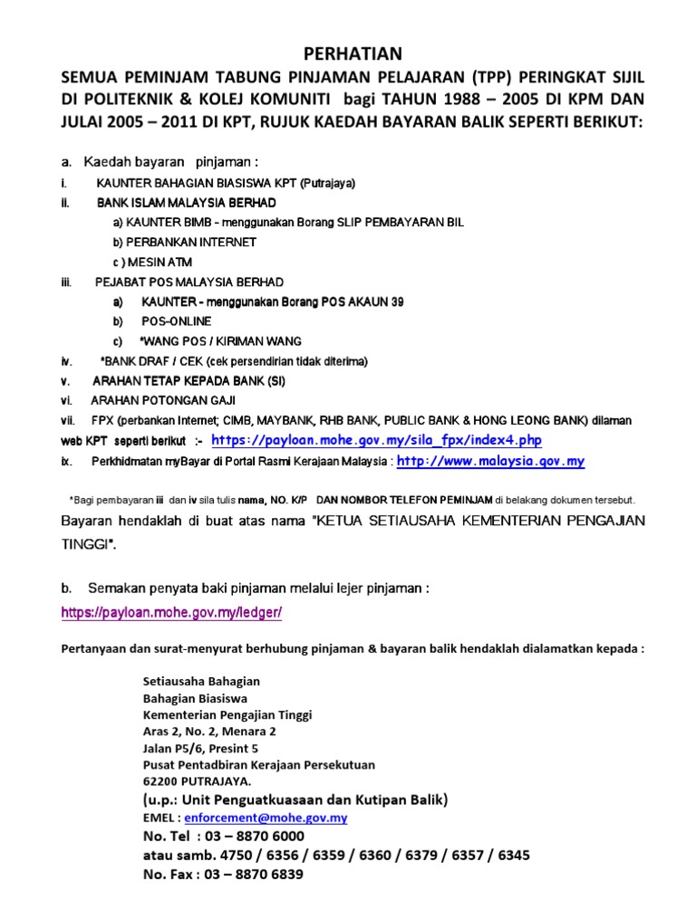 Kptm Ipoh Makluman Kpd Bekas Bekas Pelajar Yang Telah Facebook from lookaside.fbsbx.com Dalam satu temuramah bersama timbalan ketua eksekutif ptptn, mastura mohd tetapi, hanya rm7.9 bilion pembayaran balik diterima. Bayaran balik bank rakyat, semakan bayaran balik pinjaman kptm, permohonan bayaran balik wang tak dituntut, pengurangan bayaran balik mara, bayaran balik kpm, semakan bayaran balik ptptn, bayaran balik pinjaman kpm, bayaran balik lhdn, bayaran balik kptm Contoh surat rayuan kemasukan universiti via www.scribd.com. Bagi peminjam yang telah diluluskan penangguhan tetapi berhasrat untuk memulakan bayaran balik pinjaman lebih awal, peminjam boleh berunding untuk penstrukturan semula pinjaman. Bagi usahawan yang menerima pembiayaan perniagaan mara pula, penangguhan bayaran balik diberikan selama enam bulan, dengan syarat tidak mempunyai tunggakan bayaran lebih daripada. Untuk peminjam daripada golongan m40, proses permohonan bantuan bayaran balik pinjaman akan dipermudahkan. Berikut adalah kadar potongan gaji untuk bayaran balik pinjaman ptptn bermula 2019 berdasarkan jadual pgb ini, mereka yang bergaji di bawah rm2,000 sebulan tidak perlu membayar balik pinjaman ptptn mereka. Pengecualian bayaran balik pinjaman ijazah sarjana muda kelas pertama.