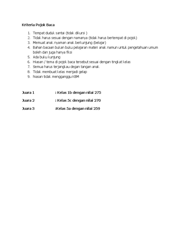 Ketiga, setiap saat siswa bisa membaca buku tanpa harus mondar mandir ke perpustakaan, sebab di kelas sudah. Seperti yang kita ketahui pemerintah bersama kemendikbud menggerakan program sudut baca atau pojok baca untuk meningkatkan minat baca pelajar di indonesia. Satu di antaranya lomba pojok baca yang diikuti oleh 12 kelas yang ada di madrasah tersebut. Buka kembali rencana kamu, keluarkan setiap bahan yang kamu butuhkan untuk menghias kelas. Pengembangan minat baca siswa melalui pojok baca mempunyai beberapa manfaat antara lain: