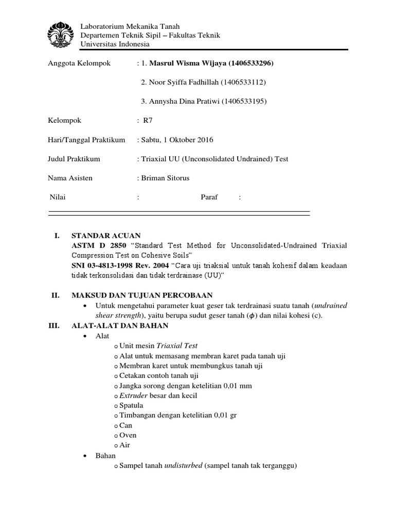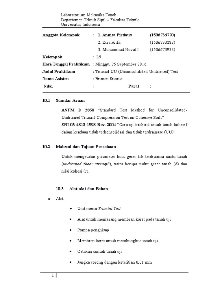 It is performed on cohesive soil samples to determine the undrained shear strength of the core sample. Quired, nonporous plates can be used instead of porous stones at the top and bottom of the soil mechanics laboratory manual 135. It has 5 deformation sensors (4 radial. The unconsolidated undrained (uu) test is the simplest and fastest procedure, with soil specimens loaded whilst only total stresses are controlled. 1.the confining pressure is not zero.
